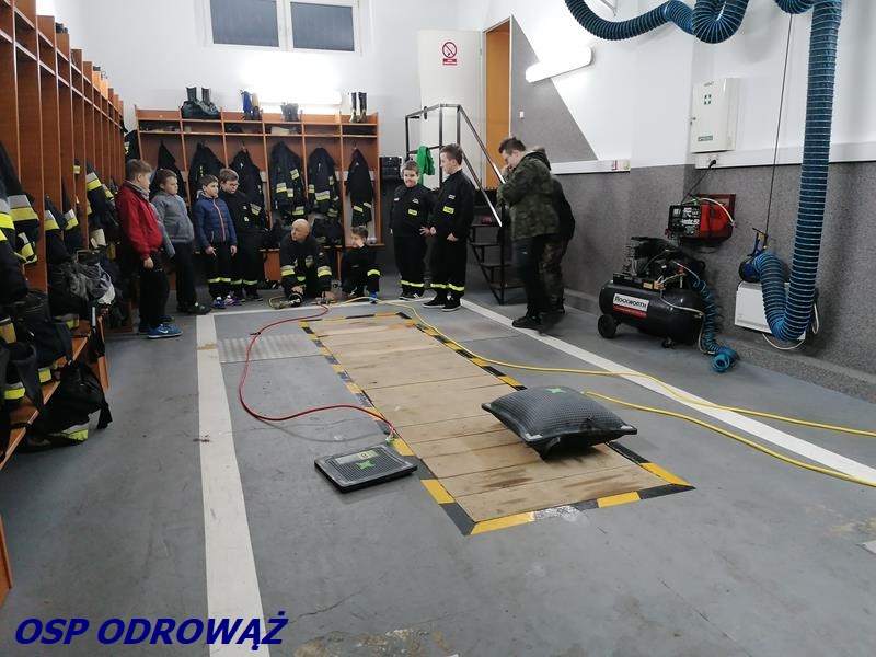 Grupa starsza zapoznała się z obsługą i zastosowaniem poduszek pneumatycznych wysokociśnieniowych. Grupa młodsza przypomniała sobie numery alarmowe, jak dzwonić i zgłosić zagrożenie.