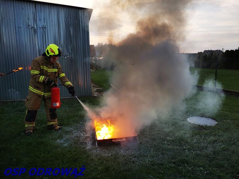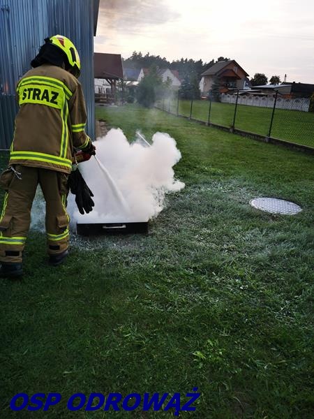 W drugiej części odbył się pokaz, jak nie należy gasić oleju oraz nauka obsługi gaśnicy proszkowej.