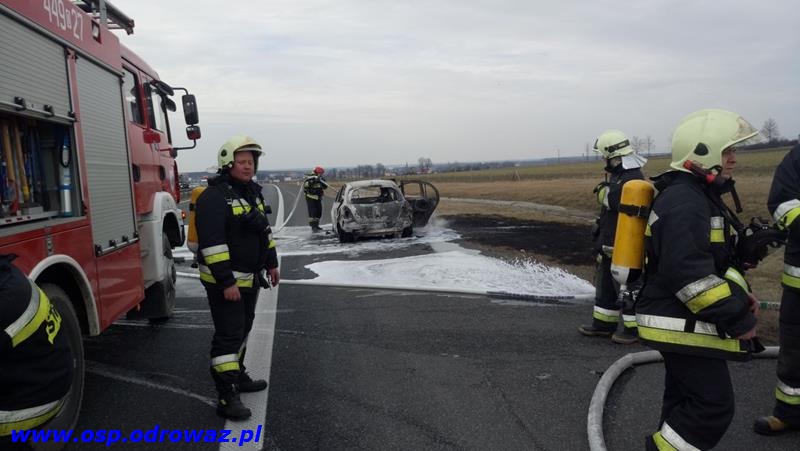 Zdarzenie miało miejsce na 255,9 km w kierunku Wrocławia. Nikt nie został ranny. Samochód osobowy uległ całkowitemu spaleniu. Do akcji wyjechaliśmy zastępem Mercedes GBA Rt 449[o]45 w sile 6 strażaków. SiS: JRG Krapkowice, OSP Jasiona, OSP Odrowąż, Patrol Autostrady, Policja. Powrót do bazy około godz. 13.