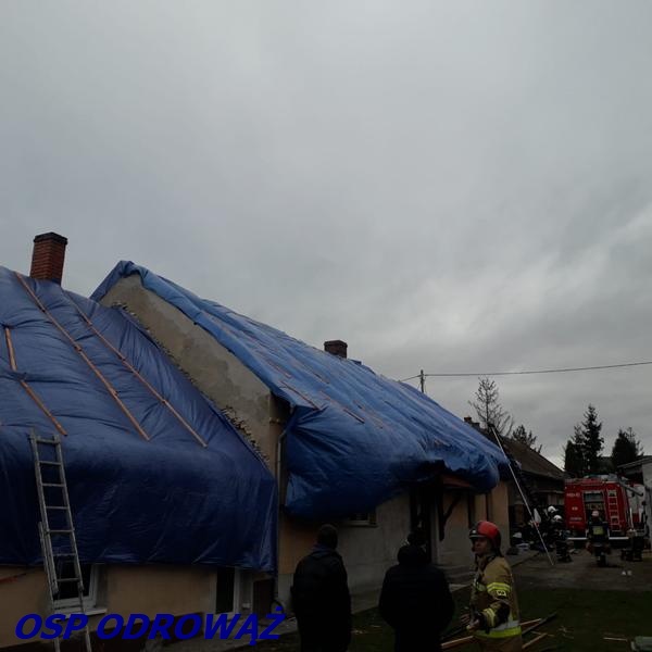 Tam, na skutek porywistego wiatru, zerwało dach z budynku mieszkalnego i gospodarczego. Wyjechaliśmy zastępem Merceds GBA Rt 449[o]45 w sile 6 ratowników. Do jednostki wróciliśmy przed godziną 9:00. SiS: JRG Krapkowice, OSP Odrowąż, GCR. Dziękujemy Gminnemu Centrum Reagowania za posiłek regeneracyjny, właścicielom za kawę i herbatę.