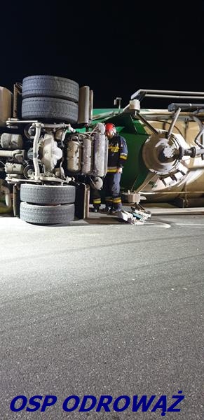 Zdarzenie miało miejsce w ciągu drogi wojewódzkiej 423. Na rondzie doszło do wywrócenia się ciężarówki. Jedna osoba poszkodowana, przekazana ZRM. Wyjechaliśmy Mercedesem GBA Rt 449[o]45 w sile 6 strażaków. Na miejscu działały zastępy JRG Krapkowice, OSP Odrowąż, ZRM, Policja. Powrót do jednostki około godziny 23:00.
