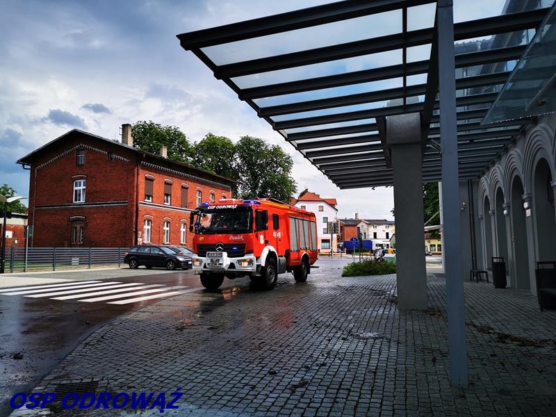Po przejściu ulewnego deszczu doszło tam do lokalnych podtopień. Nasze działania polegały na wypompowaniu wody z zalanych budynków oraz zabezpieczeniu, przy pomocy rękawów p/powodziowych oraz worków z piaskiem, przed ponownym zalaniem.